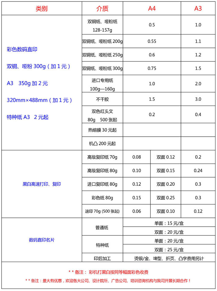 1.彩色数码直印0.5元/P(A4,量大,请电询);